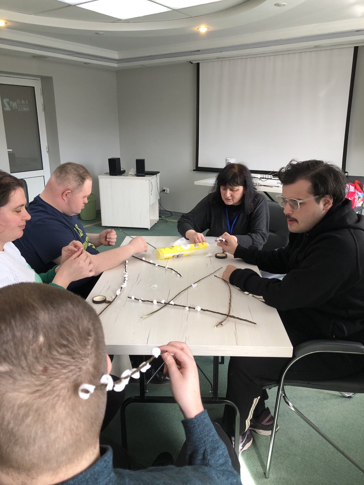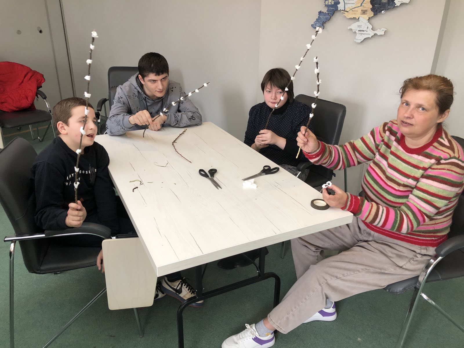 – На цьому занятті ми продовжували розвивати весняну тематику. Сьогодні в нас «вербові гілочки». Виготовлення вербових гілочок із ватних дисків, деревʼяних прутиків і тейп-стрічки це не тільки творчий, екологічний, а й дуже корисний процес. Адже під час такої діяльності учасники проєкту розвивають дрібну моторику, сенсорне сприйняття, соціалізуються та отримують емоційну підтримку, відчуття успіху та масу задоволення, – каже Зінаїда МОКРИЦЬКА.