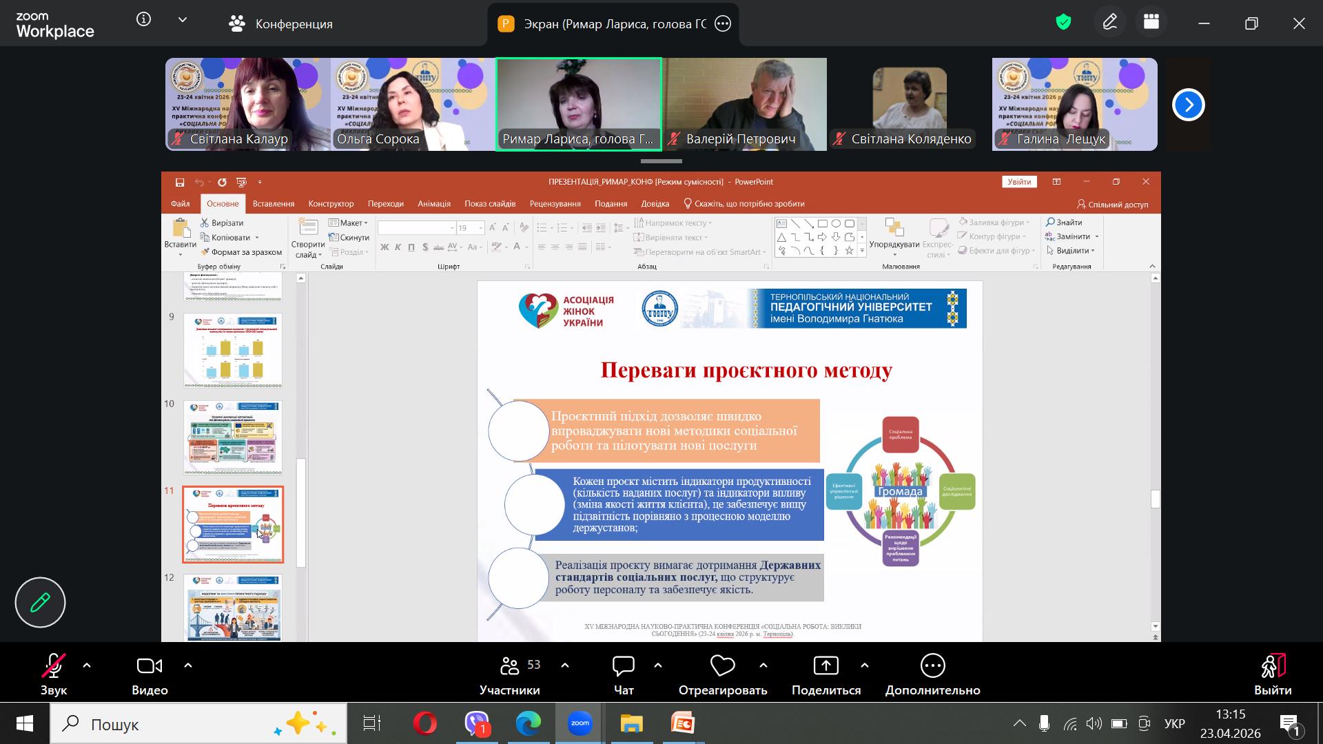 Модераторка зустрічі, завідувачка кафедри соціальної роботи та соціальної педагогіки ТНПУ, професор Ольга СОРОКА, надаючи слово Ларисі РИМАР, підкреслила надзвичайну цінність поєднання наукових розробок із живим практичним досвідом. Вона відзначила Асоціацію жінок України як взірець ефективного застосування проєктного методу у розвитку соціальної інфраструктури регіону.